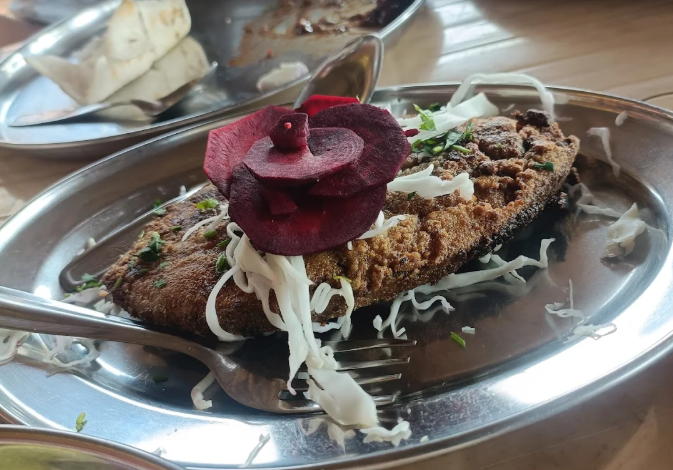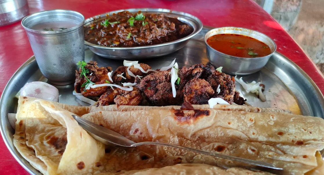Fish Thali: A wholesome platter featuring fresh catch-of-the-day (pomfret, surmai, or prawns) cooked in fiery Malvani curry, served with bhakri, rice, and solkadi.